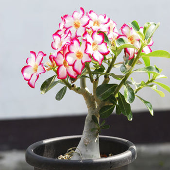 Desert Rose are a relative of the Frangipani and Oleander family and the resemblance can be seen in the flowers which can pink or reddish often with a whitish flush radiating out from the centre.