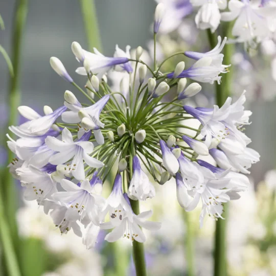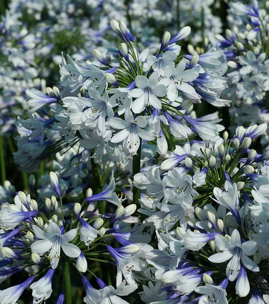 African Twister is a striking new member of the Agapanthus family, flaunting large, round clusters of bi-color blooms held up to 48" tall over strap-like green foliage. As if that weren't enough, the flowers change from blue at the throat to white on the petals' edges as if by magic!