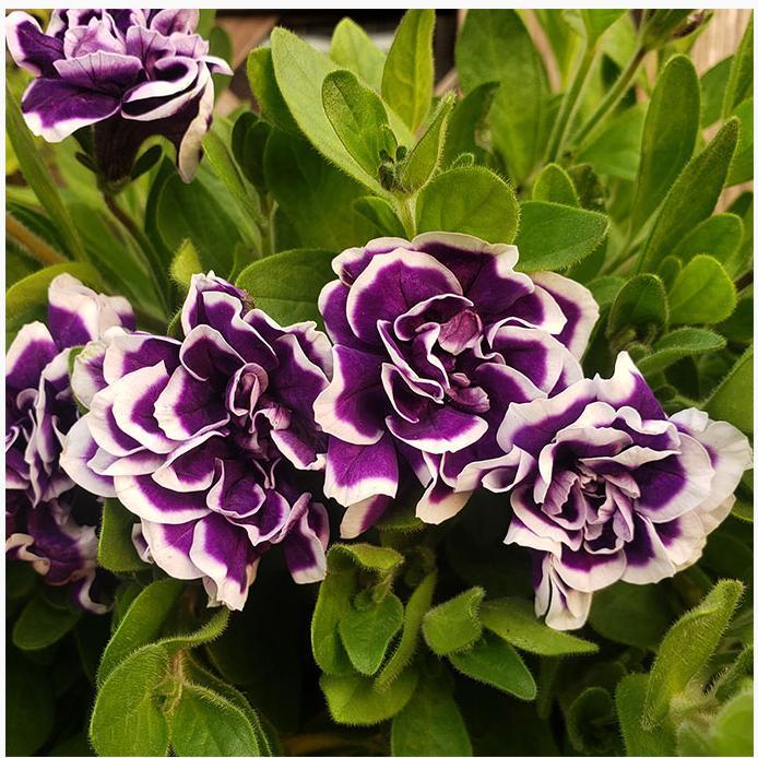 Fully double petunias with fringed flowers and beautiful white and purple picotee patterns, the Pirouettes are known for their 7.5-10 cm (3-4") blooms. Excellent annual plants suited for most locations they continue to be a popular choice for bedding plants, containers and hanging baskets. Their compact upright habit further showcases these terrific bi-color flowers.